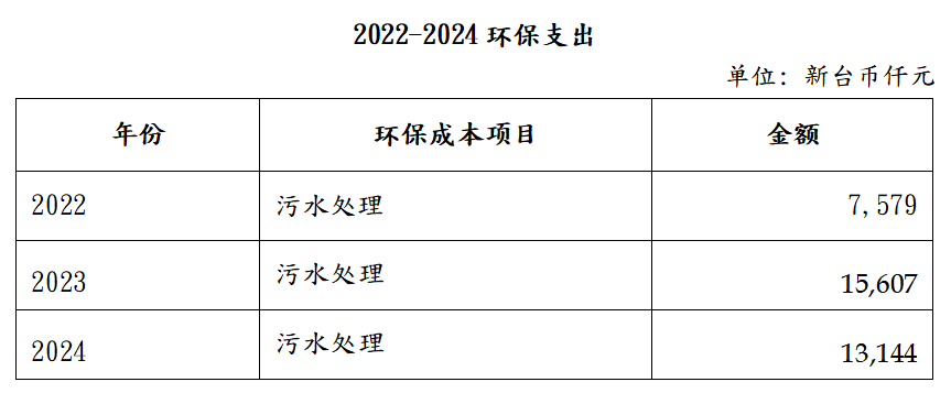 2024年污水處理成本支出為新臺幣13,144仟元(包含昆山、廣東、天津三廠),包括藥劑、能耗、人工、固廢處置、在線監(jiān)控等各項(xiàng)投入。